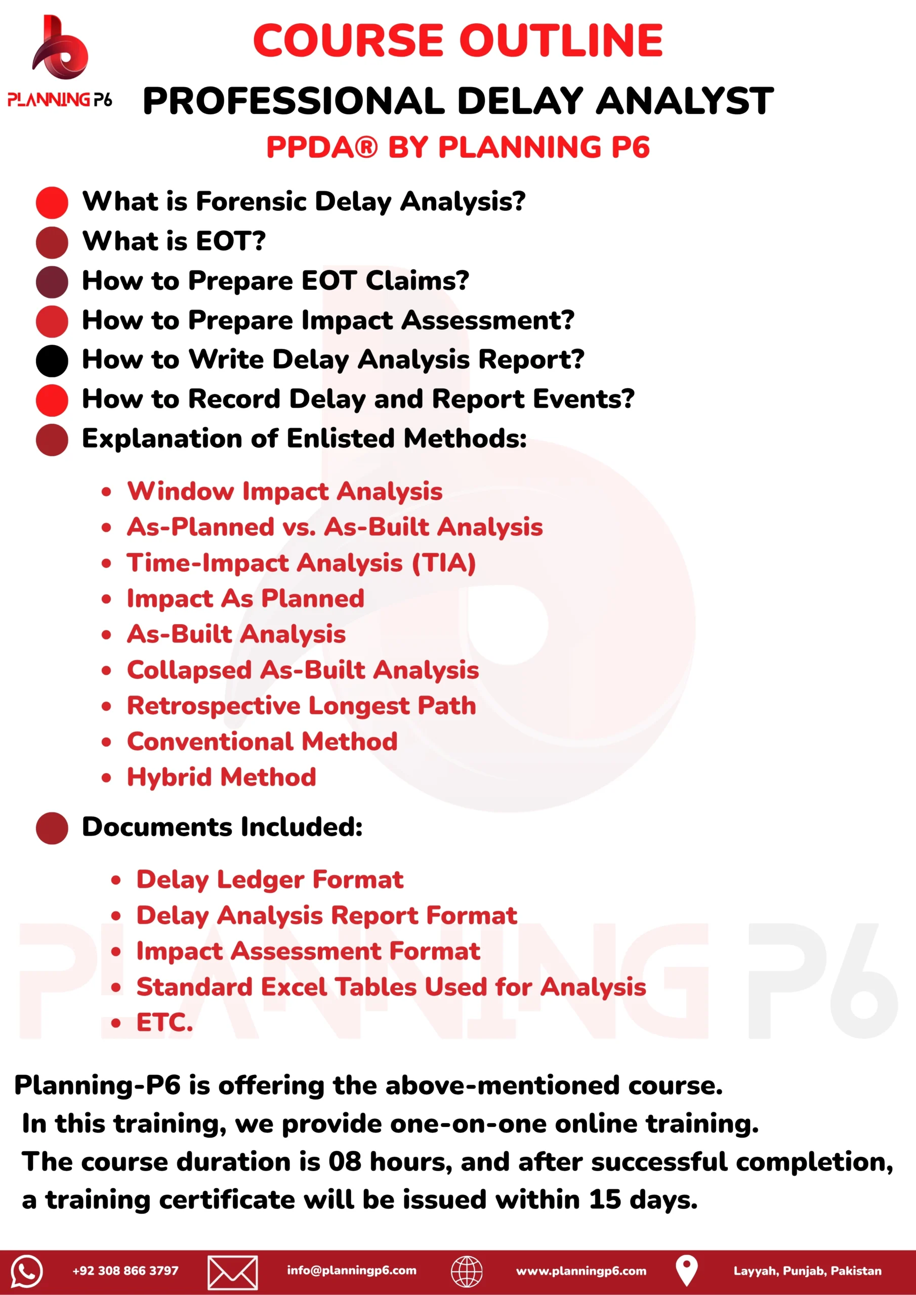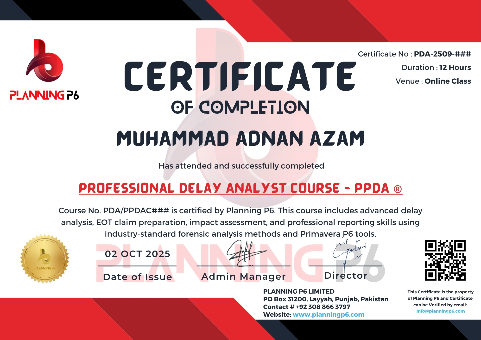 The Professional Delay Analyst (PPDA®) Training by Planning P6 is a comprehensive, expert-designed program created for planners, schedulers, project control engineers, contract engineers, quantity surveyors, and claims professionals who want to master Forensic Delay Analysis and Extension of Time (EOT) procedures in real-world projects.